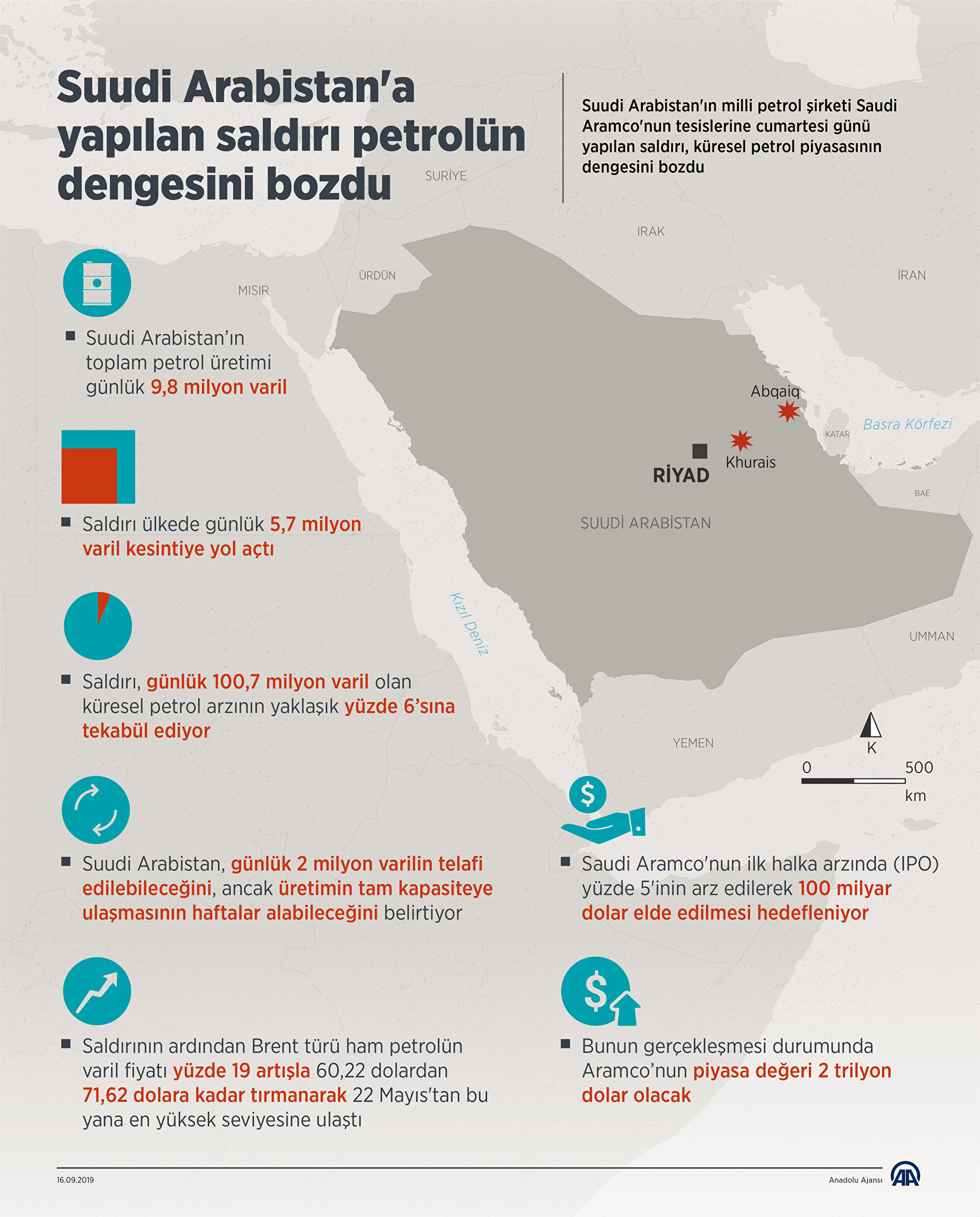 - Cumartesi günü dünyanın en büyük petrol ihracatçısı konumundaki Suudi Arabistan'ın milli petrol şirketi Saudi Aramco'nun tesislerine yapılan saldırıların ardından petrol fiyatları yükseldi.