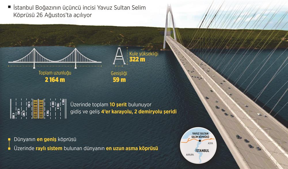 Avrupa ile Asya arasındaki üçüncü karayolu özelliğine salip Yavuz Sultan Selim Köprüsü'nün açılışına Avrupa ve Orta Asya'daki bir çok devlet yetkilisinin yanısına muhalefet liderleri de katılıyor Törene ev sahipliği yapacak olan Ulaştırma, Denizcilik ve Haberleşme Bakanlığı, CHP Genel Başkanı Kemal Kılıçdaroğlu ve MHP Genel Başkanı Devlet Bahçeli'ye Yavuz Sultan Selim Köprüsü'nün bugün yapılacak açılış töreni için davetiye gönderdi. Temeli 30 Mayıs 2013 tarihinde atılan ve 27 ay gibi rekor bir sürede tamamlanan Yavuz, dünyanın en geniş köprüsü olma özelliği taşıyor.