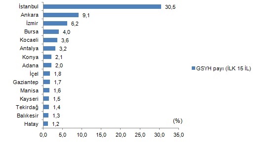 İl düzeyinde GSYH hesaplamalarına göre; 2014 yılı için İstanbul 622 milyar 762 milyon TL ile en yüksek gayrisafi yurtiçi hasılaya ulaştı ve toplam gayrisafi yurtiçi hasıladan yüzde 30,5 pay aldı. İstanbul'u, 186 milyar 977 milyon TL ve yüzde 9,1 pay ile Ankara, 127 milyar 430 milyon TL ve yüzde 6,2 pay ile İzmir izledi. İl düzeyinde GSYH hesaplarında son üç sırayı 1 milyar 756 milyon TL ile Kilis, 1 milyar 416 milyon TL ile Ardahan ve 1 milyar 238 milyon TL ile Bayburt aldı.