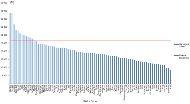 2014 yılında kişi başına gayrisafi yurtiçi hasılada, İstanbul 43 bin 645 TL ile ilk sırada yer aldı. İstanbul'u, 43 bin 521 TL ile Kocaeli ve 36 bin 680 TL ile Ankara izledi. İl düzeyinde kişi başına gayrisafi yurtiçi hasıla hesaplamalarında, 9 bin 913 TL ile Van, 9 bin 773 TL ile Şanlıurfa ve 8 bin 486 TL ile Ağrı son üç sırada yer aldı.