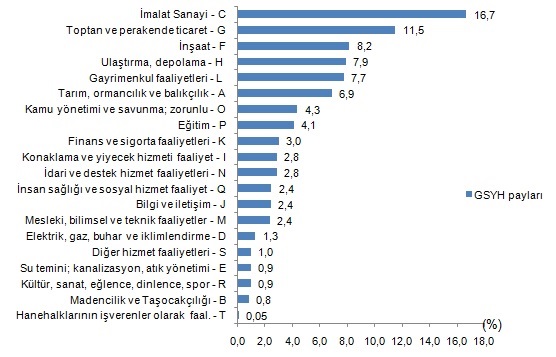 Üretim yöntemine göre cari fiyatlarla GSYH, 2015 yılında bir önceki yıla göre yüzde 14,3 artarak 2 trilyon 337 milyar 530 milyon TL oldu. 2015 yılında gayrisafi yurtiçi hasılada en yüksek payı yüzde 16,7 ile imalat sanayi aldı. İmalatı, yüzde 11,5 ile toptan ve perakende ticaret ve yüzde 8,2 ile inşaat izledi. Yıllık gayrisafi yurtiçi hasılada en düşük pay hanehalklarının işverenler olarak faaliyetleri için gerçekleşti.