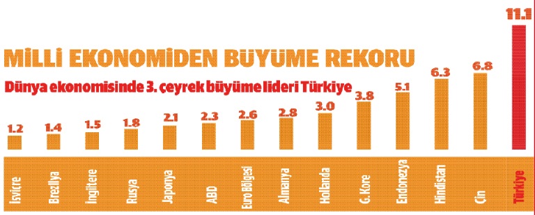 Türkiye ekonomisi üçüncü çeyrekte yüzde 11,1 ile son 6 yılın en yüksek çeyrek büyümesini gerçekleştirdi. Büyüme ortalaması yüzde 2,5 olan AB ülkelerinin dört katından fazla büyüyen Türkiye, söz konusu dönemde G20’de de Çin ve Hindistan’ı geride bırakarak ilk sıraya yerleşti.