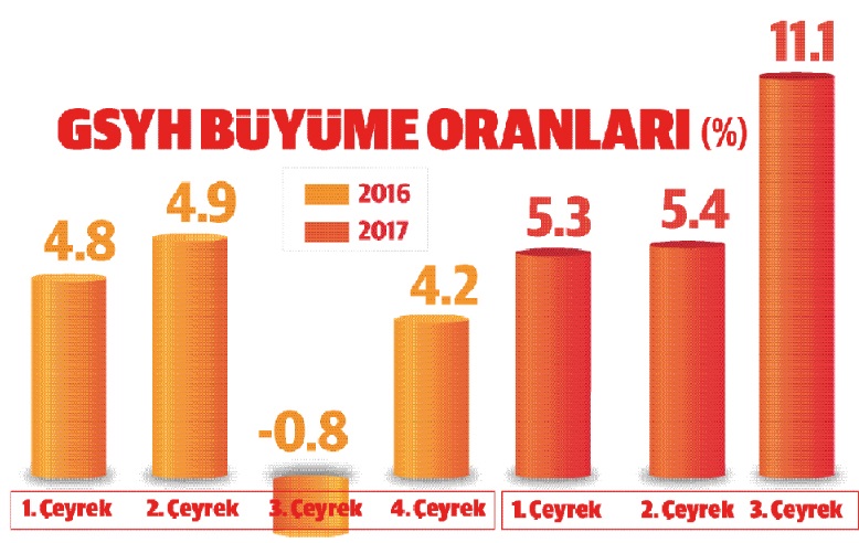Türkiye ekonomisi bu yılın üçüncü çeyreğinde geçen yıl aynı dönemde yaşanan darbe girişiminin oluşturduğu baz etkisi ve başta Kredi Garanti Fonu (KGF) olmak üzere hükümetin uyguladığı teşviklerin etkisiyle beklentilerin üzerinde yüzde 11,1 büyüyerek, son altı yılın en yüksek çeyreklik büyümesini gerçekleştirdi. GSYH, en son 2011 yılının üçüncü çeyreğinde yüzde 11,6 büyümüştü. Türkiye İstatistik Kurumu (TÜİK) verilerine göre üretim yöntemiyle gayrisafi yurt içi hasıla tahmini de aynı dönemde cari fiyatlarla yüzde 24,2 yükselerek, 827 milyar 230 milyon lira olarak belirlendi.