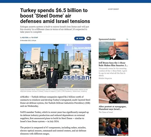 Çelik Kubbe'yi güçlendirmek amacıyla Türk savunma sanayisi bünyesinde 6,5 milyar dolar değerinde sözleşmeler imzalandı. Anlaşma İsrail basınında geniş yer bulurken, Tel Aviv'in Türkiye'nin savunmadaki atılımlarından rahatsız olduğu yazıldı.