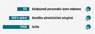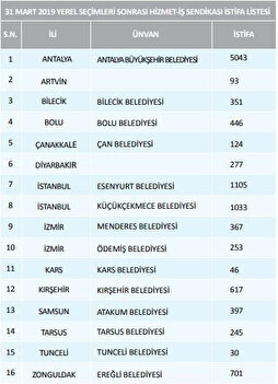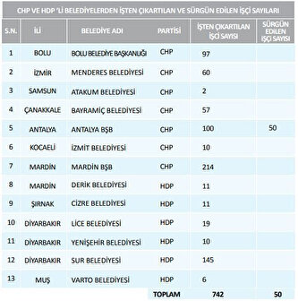 Belediyelerde çalışan işçilerden ise Hak-İş Konfederasyonuna bağlı Hizmet-İş Sendikasında ise 742 işçinin işten atıldığı, 50 sendika üyesinin sürgün edildiği, 12.500 üyenin de baskıyla istifa ettirildiği ortaya çıktı.