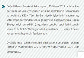 mevcut sendikalarından istifa etmeleri ve söz konusu partilerin yandaş sendikalarına üye olmaları için istifa formu ve üyelik formu konuldu. Bunun dışında Bem-Bir-Sen üyelerinin cep telefonlarına mesajlar gönderilerek Tüm Bel-Sen ve Tüm Yerel-Sen’e üye olmaları yönünde baskı yapıldı.