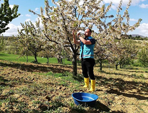 Bu konuda bilgi veren Ziraat Yüksek Mühendisi Ahmet Kaan Selvi, "İlçemizde yoğun olarak yetiştiriciliği yapılan kiraz ve vişne ağaçlarında görülen bakla zınnı denilen zararlının populasyonunda artış görülmüştür. Bu zararlı özellikle meyvelerde çiçeklerin dişi ve erkek organlarını yiyerek ekonomik kayıplara yol açmaktadır. Bakla zınnı zararlısına karşı biyoteknik mücadele yöntemlerinden biri olan renk tuzakları meyve bahçelerinde uygulanmaktadır. Renk tuzaklarından biri olan mavi leğen uygulamasını üreticilerimizin bahçelerinde dekara 2 adet olacak şekilde uygulayıp başarılı sonuçlar aldık. İlçemizde organik tarımın yaygınlaşmasıyla zararlılara karşı savaşımda alternatif mücadele yöntemleri üzerinde duruyoruz. Böylelikle hem pestisit kullanımını hem de üreticilerimizin tarımsal girdilerini azaltmayı hedefliyoruz" dedi.