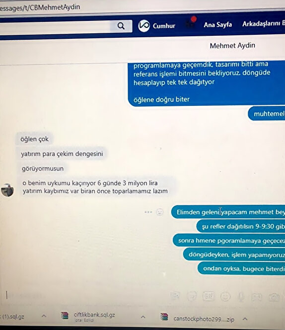 Çiftlik Bank ile yaklaşık 130 bin kişiyi 1 milyar 139 milyon 972 bin TL dolandırarak kayıplara karışan, 'Tosun' lakaplı, firari sanık Mehmet Aydın ve ekibine ait ilk kez ortaya çıkarılan yazışmaların birinde, Aydın'ın, sistemin yazılımcısı Cudi Cumhur Yurdakul ile Facebook üzerinden yazıştığı ve sistemde 6 günde 3 milyon TL yatırım kaybı yaşaması nedeniyle Yurdakul'a "Uykumu kaçırıyor" dediği yer alıyor.