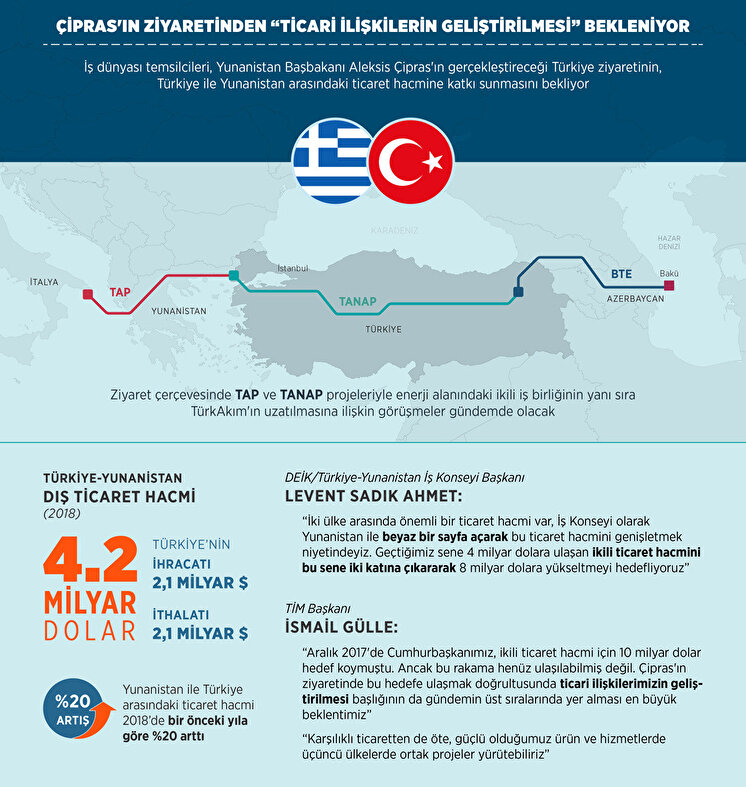İş dünyası temsilcileri, Yunanistan Başbakanı Çipras'ın yarın gerçekleştireceği Türkiye ziyaretinin Türkiye ile Yunanistan arasındaki ticaret hacmine katkı sunmasını bekliyor.