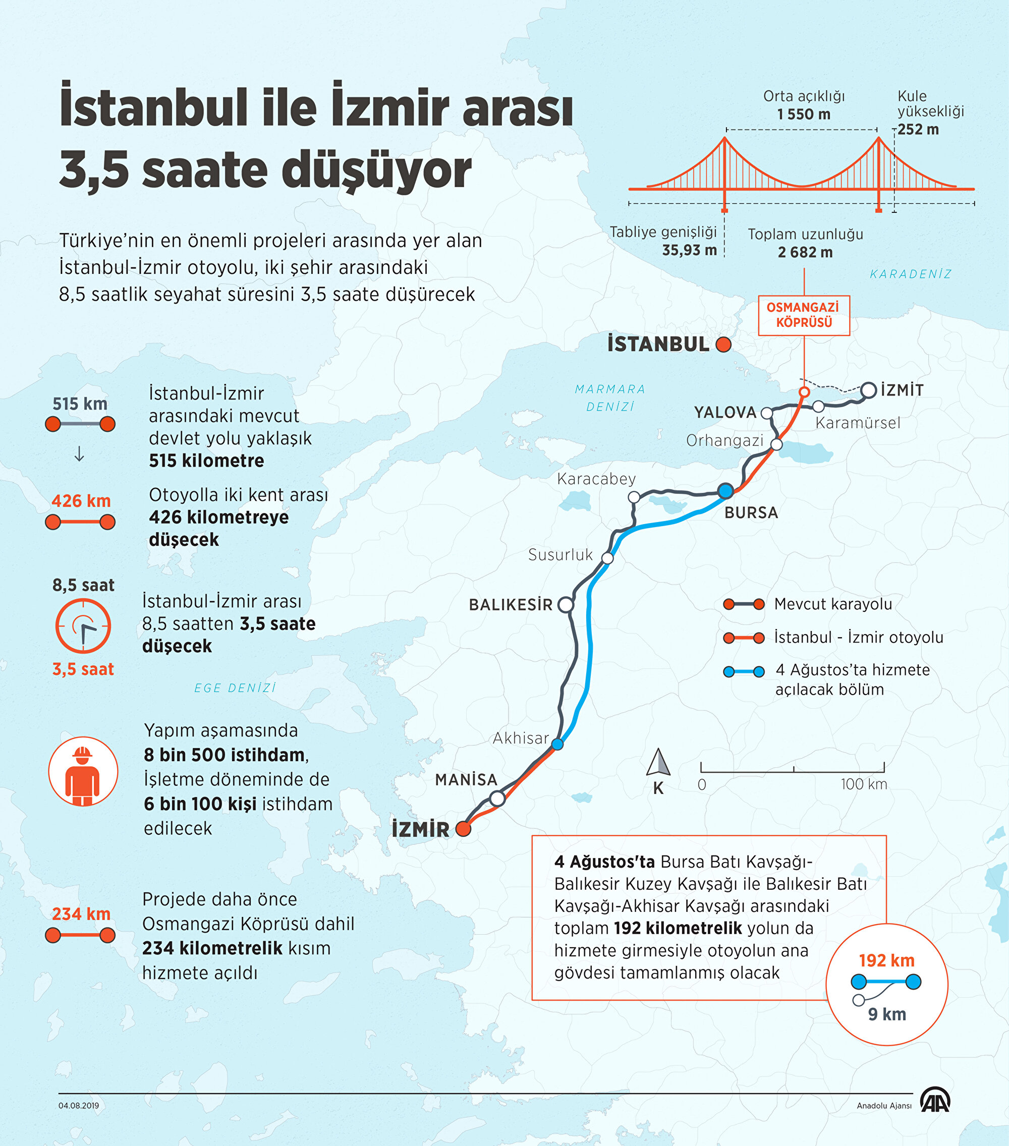 Toplam 426 km'lik İstanbul-Bursa-İzmir Otoyolu'nun tamamını hizmete sunmuş oluyoruz. Maliyeti 11 milyar dolar olan bu projenin ülkemize katkısı 3.5 milyar dolar.