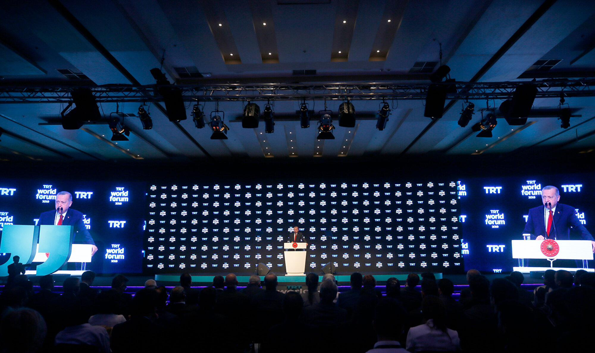 Türkiye Cumhurbaşkanı Recep Tayyip Erdoğan, İstanbul Kongre Merkezi'nde "Küreselleşmenin Krizi: Riskler ve Fırsatlar" ana temasıyla düzenlenen TRT World Forum 2019'da katılımcılara hitap etti.