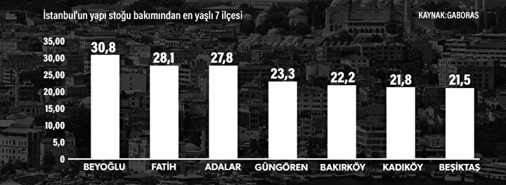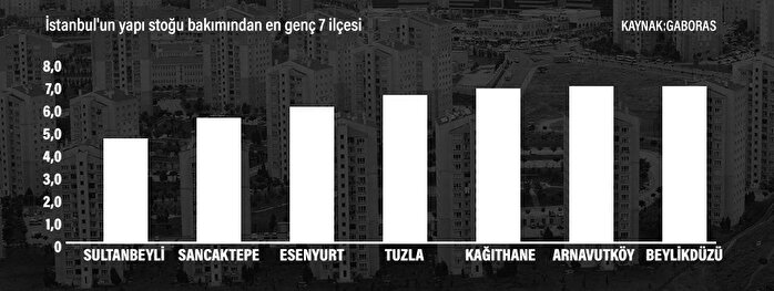 İstanbul'un en yaşlı yapı stoğu 7 ilçede bulunuyor. Söz konusu ilçeler arasında ortalamaya bakıldığında en yaşlı ilçe ise 30 yıl ile Beyoğlu. Beyoğlu'nu 28 yıl ile Fatih, 27 yıl ile Adalar, 23 yıl ile Güngören, 22 yıl ile Bakırköy, 21 yıl ile Kadıköy ve Beşiktaş izliyor. İstanbul'un yapı stoğu bakımından en genç ilçesi ise 4 - 5 yaş aralığı ile Sultanbeyli olarak öne çıkıyor.