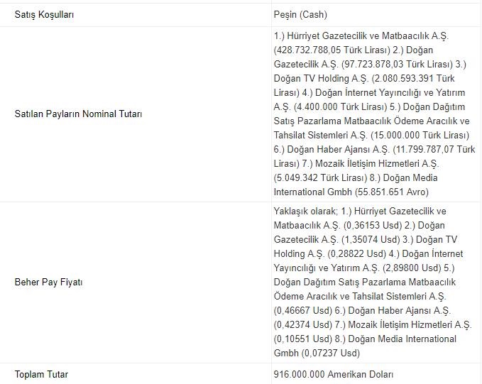 Doğan Holding, medya iştiraklerinin satışına ilişkin Kamuyu Aydınlatma Platformu'na açıklama yaptı. Demirören Grubu, 916 milyon dolara Hürriyet, Posta, Fanatik gazeteleriyle Kanal D ve CNN Türk televizyonlarının da aralarında bulunduğu çok sayıda yayın kuruluşunun sahibi oldu. Doğan Grubu ile Demirören arasında yapılan anlaşmaya göre 916 milyon dolarlık satış bedeli peşin ödeneceği açıklandı.