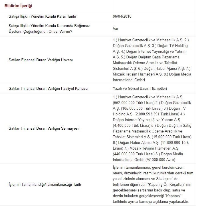 Akşam saatlerinde Kamuyu Aydınlatma Platformu’nda Doğan Holding tarafından yayınlanan açıklamaya göre Demirören Medya Yatırımları Ticaret A.Ş. ile yapılan pazarlıklar neticesinde;