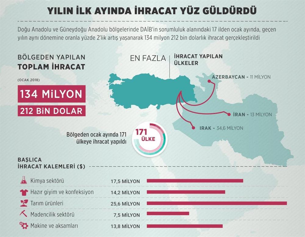Doğu Anadolu İhracatçılar Birliği (DAİB) verilerinden yapılan derlemeye göre, bu yıl ocak ayında, DAİB'in sorumluluk alanında yer alan Ağrı, Ardahan, Batman, Bayburt, Bingöl, Bitlis, Erzurum, Erzincan, Elazığ, Iğdır, Hakkari, Muş, Şırnak, Tunceli, Van, Kars ve Siirt'ten 171 ülkeye ihracat gerçekleştirildi.