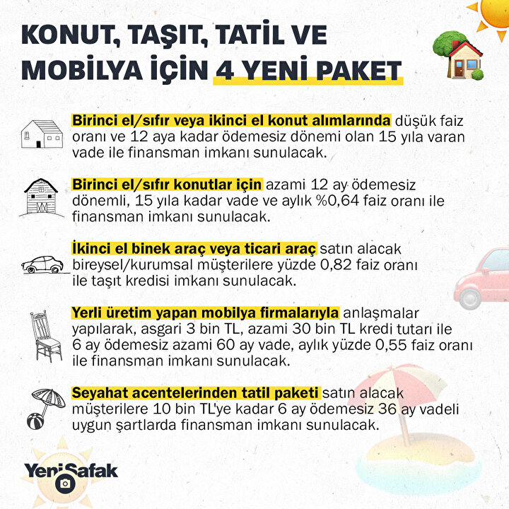 Konut, taşıt, tatil ve sosyal harcamaları kapsayan kredi paketleri ilgili sektörlerde heyecana yol açtı. Düşük faiz ve ödeme ertelemeli finansman paketlerini yorumlayan sektör temsilcileri bir daha bu kadar düşük faiz oranlarının gündeme gelmeyebileceğini ve ortaya tarihi bir fırsatın çıktığını dile getirirken, sunulan kredi paketlerine ilişkin kampanya hazırlıklarına da başlayacağını belirtiyor.
