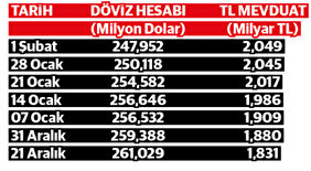 - Merkez Bankası’nın tebliğiyle, kur korumalı hesapta, kur farkı kazançlarına kurumlar vergisi istisnası sağlanan şirketler de dövizden hızlı çıkmaya başladı. BDDK verilerine göre, 24 Ocak’ta 93 milyar 233 milyon dolar olan şirketlerin döviz hesapları, 1 Şubat itibariyle 89 milyar 240 milyon dolara geriledi. Böylelikle yedi iş gününde şirketlerin bozdurduğu döviz tutarı 4 milyar dolara buldu.