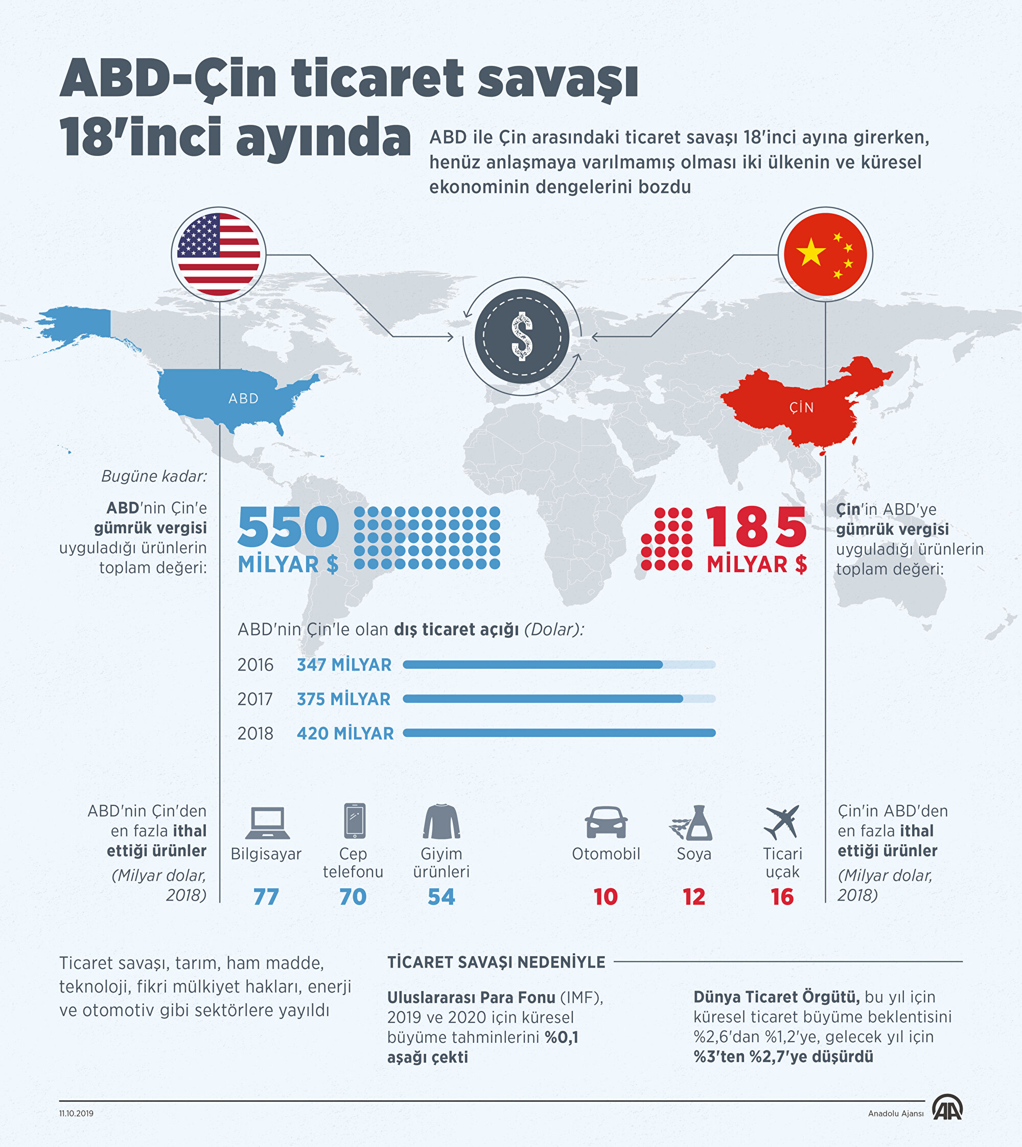 ABD ile Çin arasındaki ticaret savaşı 18'inci ayına girerken, henüz anlaşmaya varılmamış olması iki ülkenin ve küresel ekonominin dengelerini bozdu. Dünyanın en büyük iki ekonomisi arasındaki ticaret savaşı tarım, ham madde, teknoloji, fikri mülkiyet hakları, enerji ve otomotiv gibi birçok sektöre yayıldı. Bugüne kadar ABD, Çin'den ithal ettiği 550 milyar dolar değerinde ürüne ek gümrük vergisi uygularken, Çin hükümeti ise 185 milyar dolarlık ürüne gümrük tarifesi getirerek misilleme yaptı.