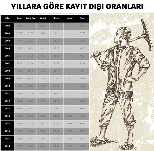 Bu da her 3 çalışandan birinin kayıt dışı çalıştığı anlamına geliyor. Söz konusu rakam ile istihdam edilen yaklaşık 29 milyon kişi üzerinden yapılan hesaplamada 10 milyona yakın kişinin kayıt dışı çalıştığı ortaya çıkıyor.