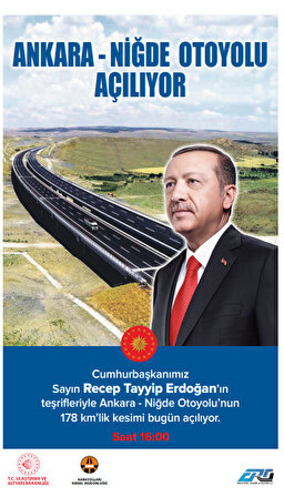Ulaştırma ve Altyapı Bakanlığı tarafından Yap-İşlet Devret (YİD) yöntemi ile yapılan Ankara-Niğde Otoyolu’nun 105 kilometrelik Ankara- Acıkuyu Kavşağı Arası 1’inci kesimi ile 57 kilometrelik Alayhan Kavşağı – Gölcük Kavşağı arasındaki 3’üncü kesim Cumhurbaşkanı Recep Tayyip Erdoğan ile Ulaştırma ve Altyapı Bakanı Adil Karaismailoğlu’nun katılacağı törenle hizmete açılıyor. 275 kilometresi otoyol, 55 kilometresi bağlantı yolu olmak üzere 330 kilometre uzunluğundaki otoyol, Ankara’yı, Mersin’e, Adana'ya, Gaziantep'e, Hatay’a ve Şanlıurfa'ya kesintisiz otoyol ile bağlayacak. Ankara - Niğde Otoyolunun tamamlanması ile Edirne’den Şanlıurfa’ya bin 230 kilometre kesintisiz ulaşım sağlanacak.