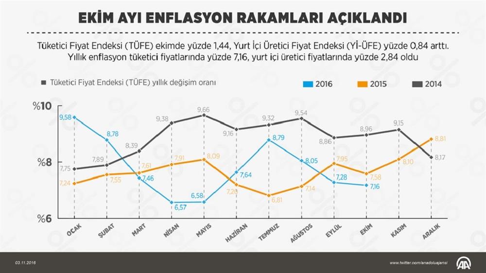 Türkiye İstatistik Kurumu (TÜİK) verilerine göre, TÜFE, ekimde bir önceki aya göre yüzde 1,44, geçen yılın aralık ayına göre yüzde 6,23, geçen yılın aynı ayına göre yüzde 7,16 ve on iki aylık ortalamalara göre yüzde 7,89 artış gösterdi.