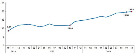 TÜFE'de 2021 yılı Ekim ayında bir önceki aya göre %2,39, bir önceki yılın Aralık ayına göre %15,75, bir önceki yılın aynı ayına göre %19,89 ve on iki aylık ortalamalara göre %17,09 artış gerçekleşti.