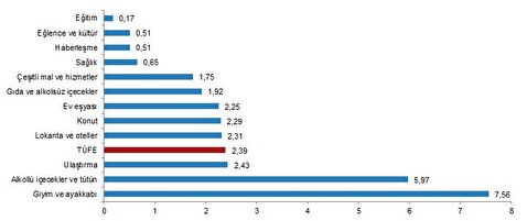 Yıllık en düşük artış %5,29 ile haberleşme grubunda gerçekleşti. Bir önceki yılın aynı ayına göre artışın düşük olduğu diğer ana gruplar sırasıyla, %7,88 ile alkollü içecekler ve tütün, %8,08 ile giyim ve ayakkabı ve %13,12 ile eğlence ve kültür oldu. Buna karşılık, bir önceki yılın aynı ayına göre artışın yüksek olduğu ana gruplar ise sırasıyla, %27,41 ile gıda ve alkolsüz içecekler, %25,23 ile lokanta ve oteller ve %23,03 ile ev eşyası oldu.