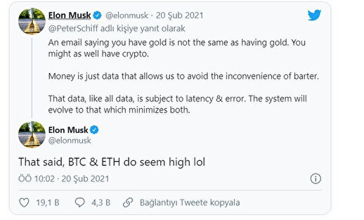 Hafta sonu Twitter mesajında Bitcoin ve Ethereum'un değerinin yüksek olduğunu söyleyen Elon Musk, bilançosuna 1.5 milyar dolar değerinde Bitcoin varlıkları dahil eden Tesla'nın hisselerinde eylül ayından bu yana yaşanan en büyük düşüşe neden oldu.