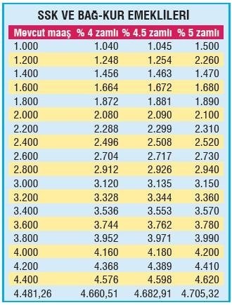 Yaklaşık 9 milyon SSK ve Bağ-Kur emeklisi Temmuz zammı için enflasyonu takibe aldı. Zam oranının ortaya çıkması için ilk 6 aylık enflasyon verisinin belli olması gerekiyor. Ocak-Mart enflasyonun yüzde 2.77 çıkmasının ışığında uzmanlar, ilk 6 aylık Tüketici Fiyat Endeksi yani emeklilerin zam oranı için 'yüzde 4, yüzde 4.5, yüzde 5' şeklinde 3 farklı tahminde bulunuyor. TAKVİM, bu tahminler ışığında emeklilerin yeni maaşlarını hesapladı. Hazırladığımız tabloya bakan emekliler, bu tahminlere göre yeni maaşları hakkında bilgi sahibi olabilecek.