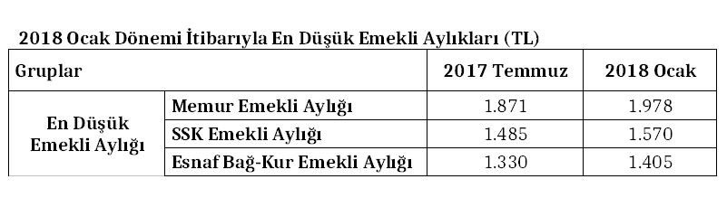 Bu dönemde SSK ve Bağ-Kur emekli aylıklarında ise yüzde 5,69 oranında artış sağlandı. Böylece en düşük SSK emekli aylığı bin 485 TL’den bin 570 TL’ye, en düşük esnaf Bağ-Kur emekli aylığı ise bin 330 TL’den bin 405 TL’ye yükseldi.