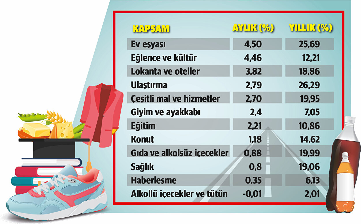 - Pandemi nedeniyle ertelenen talebin zirve yaptığı haziranda fiyatlar ev eşyasında yüzde 4,50, eğlence-kültürde yüzde 4,46, lokanta-otellerde yüzde 3,82, ulaştırmada yüzde 2,97, çeşitli mal ve hizmetlerde yüzde 2,70, giyim ve ayakkabıda yüzde 2,40, konutta 1,18, gıda ve alkolsüz içeceklerde yüzde 0,88 ve sağlıkta ise 0,8 yükseldi. Alkollü içecek ve tütün ise aylık artış yüzde 0,01 geriledi.