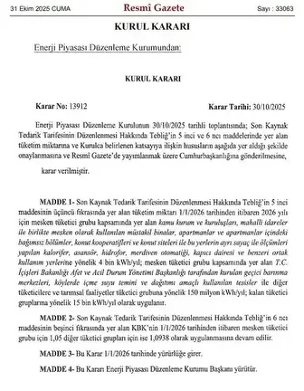 Enerji Piyasası Düzenleme Kurulu'nun (EPDK) 2026 yılı için uygulanacak "Son Kaynak Tedarik Tarifesi"ne ilişkin kurul kararı Resmi Gazete'de yayımlandı.
