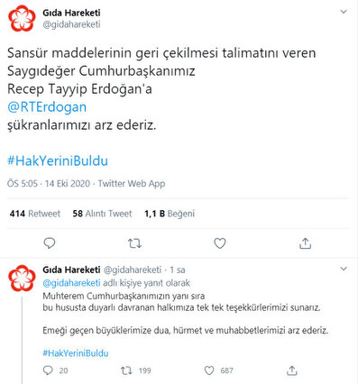 'Gıda ve beslenme yayıncılığına sansür getirecek düzenleme' olarak adlandırılan kanun teklifinin Cumhurbaşkanı Erdoğan'ın talimatı ile geri çekildiği öğrenildi. TBMM Tarım, Orman ve Köyişleri Komisyonu Başkanı Yunus Kılıç, Gıda Kanunu'nu teklifinde yer alan bazı maddelerin tekliften çıkarılacağını açıkladı. Gıda Güvenirliği Hareketi, sosyal medyadan açıklama yaparak Erdoğan'a teşekkür etti.