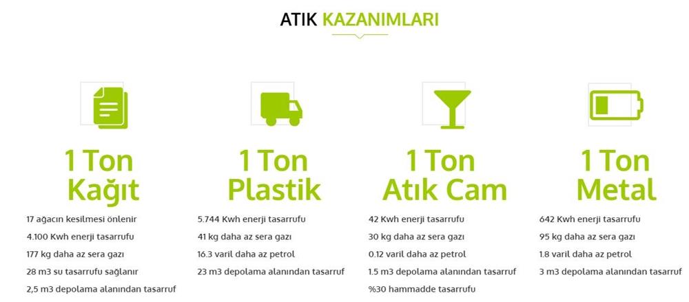 Öyle ki atıkların dönüşüm karşılıkları da bir hayli dikkat çekici. 1 ton kağıt ile 17 ağaç kesilmekten kurtulurken, bu rakam 1 ton plastikte 16 varillik petrol tasarrufuna 1 ton camda 30 kg daha az sera gazına 1 ton metalde ise 642 kwh enerji tasarrufuna denk geliyor.