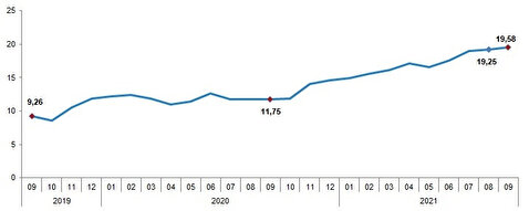 TÜFE'de 2021 yılı Eylül ayında bir önceki aya göre %1,25, bir önceki yılın Aralık ayına göre %13,04, bir önceki yılın aynı ayına göre %19,58 ve on iki aylık ortalamalara göre %16,42 artış gerçekleşti.
