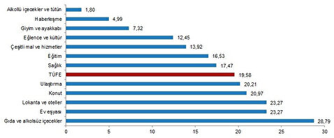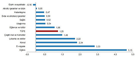 Buna karşılık, 2021 yılı Eylül ayında artışın yüksek olduğu gruplar ise sırasıyla, %5,15 ile eğitim, %3,33 ile ev eşyası ve %2,34 ile konut oldu.