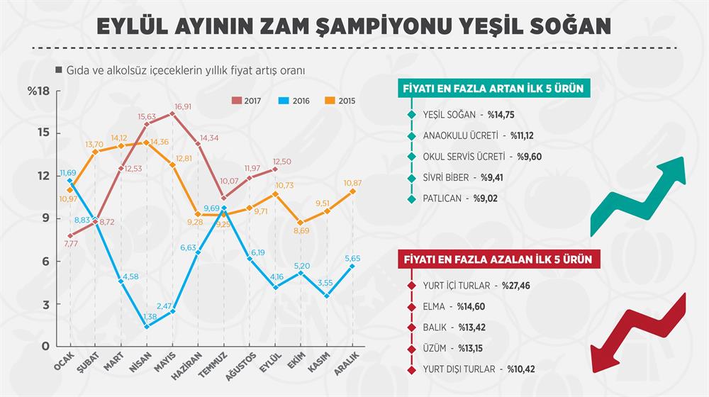 Eylülde fiyatı en çok artış gösteren diğer ürünler ise yüzde 9,60 ile okul için servis ücreti, yüzde 9,41 ile sivri biber, yüzde 9,02 ile patlıcan, yüzde 8,62 ile çocuk spor kazağı (sweatshirt), yüzde 8,18 ile yurt ücretleri, yüzde 7,58 ile antep fıstığı, yüzde 7,48 ile domates ve yüzde 6,95 ile limon oldu.