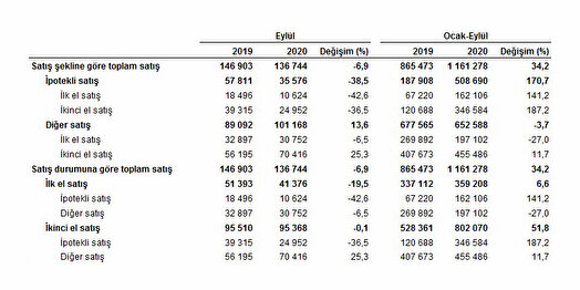 İpotekli konut satışları eylülde geçen yılın aynı ayına göre yüzde 38,5 azalış göstererek 35 bin 576'a düştü. Toplam konut satışları içinde ipotekli satışların payı yüzde 26 olarak belirlendi. İpotekli satışlarda İstanbul 7 bin 527 konut ve yüzde 21,2 payla ilk sırada yer aldı. Toplam konut satışları içinde ipotekli satış payının en az olduğu il 1 konutla Hakkari oldu. Diğer konut satışları eylülde yıllık bazda yüzde 13,6 artışla 101 bin 168 adet olarak tespit edildi. Bu kategoride İstanbul 17 bin 872 konut satışı ve yüzde 17,7 payla ilk sırada yer aldı. İstanbul'daki toplam konut satışları içinde diğer satışların payı yüzde 70,4 olarak hesaplandı. Ankara 8 bin 875 diğer konut satışıyla ikinci sırada yer alırken, bu ili 5 bin 745 konut satışıyla İzmir izledi. Diğer konut satışının en az gerçekleştiği il 16 konutla Hakkari oldu.
