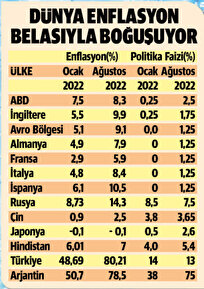 ABD Merkez Bankası Fed; mart ayından bu yana 250 baz puanlık faiz artışı yaptığı halde, ABD’de enflasyon yüzde 9,1 ile 41 yılın zirvesine çıktı. Mart ayında varlık alım operasyonunu tamamlayarak faiz artışlarına başlayan Fed; martta 25 baz puan, mayısta 50 baz puan, haziranda 75 baz puanla faiz artışı yapmıştı. ABD’de enflasyon ağustosta yüzde 8,3’e gerilese de Fed’in bu hafta, 75-100 baz puan arasında bir faiz artışı daha yapması bekleniyor.