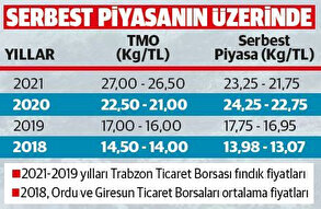 Fındık üretiminde açık ara dünya birincisi Türkiye’de üreticiye verilen fiyat yüzleri güldürdü. Giresun kalitede kilogram başı 27 lira, levant kalitede 26,5 liralık taban alım fiyatları serbest piyasanın da üzerinde geldi. Trabzon Ticaret Borsası verilerine göre, bu yıl haziran ayında yağlı fındık en yüksek 23,5 lira, levant kalite fındıkta 22,2 liradan işlem gördü. Toprak Mahsulleri Ofisi’nin (TMO) açıkladığı 27 lira ve 26,5 liralık alımlar, fındığa serbest piyasanın da üzerinde fiyat verildiğini ortaya koydu. Söz konusu rakam kilo başına 3.1 dolara denk geldi. Üreticiler, alan destekleriyle bu rakamın 3.5 dolara yaklaştığına dikkat çekti. Fındık üreticileri ve sektör temsilcileri, TMO müdahale alım fiyatlarından memnuniyetlerini dile getirdi.
