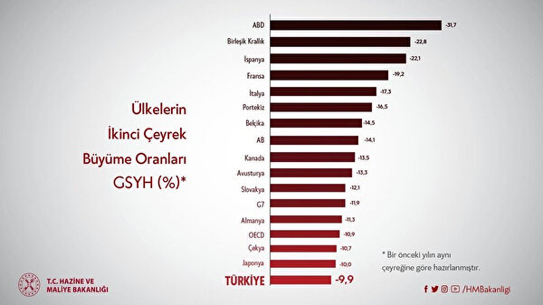 Beklentilerin altında gelen bu küçülmeyle Türkiye, şu ana kadar 2. çeyrek büyüme verisi açıklayan G20 ülkeleri arasında Türkiye iyi performans gösteren 7. ülke oldu.