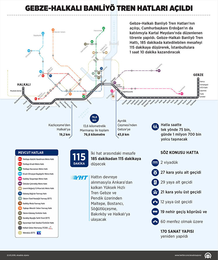 Erdoğan "Gebze – Halkalı tren hattı eskiden 185 dakikada kat edilebilen bir mesafeyken şimdi 115 dakikaya inerek, İstanbullulara net 1 saat 10 dakika kazandıracak. İstanbul’un en işlek ve dolayısıyla trafik yoğunluğu en çok olan bu hat, saatte tek yönde 75 bin, gündeyse 1 milyon 700 bin yolcu taşıyacak. Bir başka ifadeyle normalde ancak 100 bin araçla taşınabilecek yolcuyu, bu hattımız tek başına gidecekleri yerlere ulaştıracak. İstanbul’un 10 ilçesi bu hattı doğrudan kullanma imkanına sahip olacak. İstanbul trafiğinde çok önemli bir rahatlamaya yol açacak" açıklamasında bulundu.