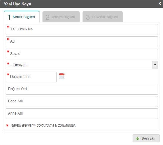 Girmiş olduğunuz bilgilerin Nüfus Müdürlüğünde bulunan bilgileriniz ile eşleşmesi gerekmektedir. Aksi takdirde üyelik işleminizi gerçekleştiremezsiniz.