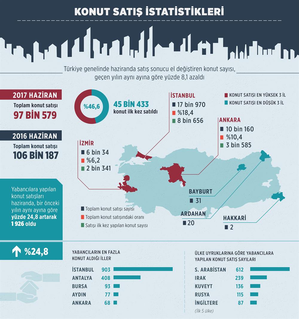 Yabancılara yapılan konut satışları bir önceki yılın aynı ayına göre yüzde 24,8 artarak bin 926 oldu. Yabancılara yapılan konut satışlarında, Haziran 2017'de ilk sırayı 903 konut satışı ile İstanbul aldı. İstanbul ilini sırasıyla 408 konut satışı ile Antalya, 93 konut satışı ile Bursa, 77 konut satışı ile Aydın, 68 konut satışı ile Ankara ve 60 konut satışı ile Muğla izledi.