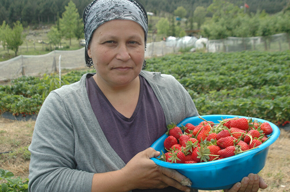 Kahramanmaraş'ın Andırın ilçesinde, 7 yıl önce hobi olarak saksıya diktiği çilek fidelerini tarlaya taşıyan Nilgün Kayıran, şimdi ürün talebine zor yetişiyor.