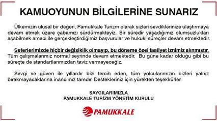 Ülkemizin ulusal bir değeri, Pamukkale Turizm olarak sizleri sevdiklerinize ulaştırmaya devam etmek üzere çabamızı sürdürmekteyiz. Bir süredir yaşadığımız olumsuzlukları aşabilmek amacıyla gerçekleştirdiğimiz başvurular ve hukuki süreçler devam etmektedir. Seferlerimizde hiçbir değişiklik olmayıp, bu döneme özel faaliyet iznimiz alınmıştır. Tüm çalışmalarımız normal seyrinde devam etmektedir. Bugüne kadar olduğu gibi bu süreçte de standartlarımızdan taviz vermeyeceğiz. Sevgi ve güven ile yıllardır bizi tercih eden tüm yolcularımızın bizleri yalnız bırakmayacaklarına inancımız tamdır. Destekleriniz için yürekten teşekkürler.