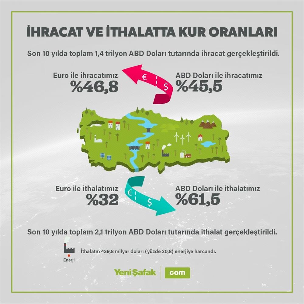 Üretimin tesislerinin çalışması için gerekli enerjinin önemli bölümünün yurt-dışından sağlandığını ifade eden Yılmaz, “Enerji ihtiyacı, Türkiye dış ticaretinin asimetrik yapısının nedeni. Toplam ithalatın yaklaşık beşte biri enerji ürünlerinden oluşuyor. Türkiye son 10 yılda toplam 2,1 trilyon ABD Doları tutarında ithalat gerçekleştirirken 439,8 milyar dolar (yüzde 20,8) enerjiye harcandı. Enerji ürünleri, uluslararası piyasalarda ABD doları cinsinden işlem görmekte. Bu nedenle Türkiye ithalat faturasında ABD dolarının ciddi bir ağırlığı söz konusu. İthalatımızın yüzde 61,5’ni ABD doları cinsinden gerçekleştiriyoruz. Euro ile ithalatımız ise yalnızca yüzde 32,2 oranında. Kabaca, ithalatımızın üçte ikisini ABD doları, üçte birini euro oluşturmakta” dedi.