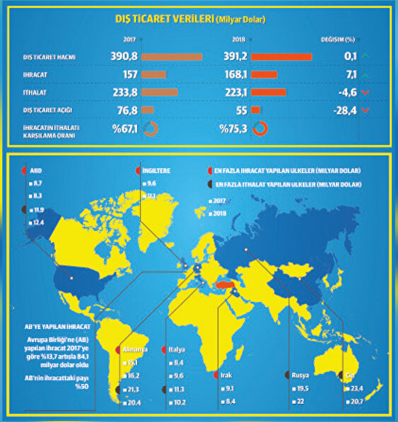 2018 yılı ihracatı yüzde 7,1 artışla 168,1 milyar dolara ulaşarak tüm zamanların rekorunu kırdı. Geçen yıl ithalat yüzde 4,6 düşüşle 223 milyar dolar olarak gerçekleşirken, ihracatın ithalatı karşılama oranı 2018 yılında 8,2 puan artışla yüzde 75,3’e yükseldi. Ticaret Bakanlığı verilerine göre dış ticaret açığı da geçtiğimiz yıl yüzde 28,40 azaldı ve 54 milyar 994 milyon dolara geriledi.