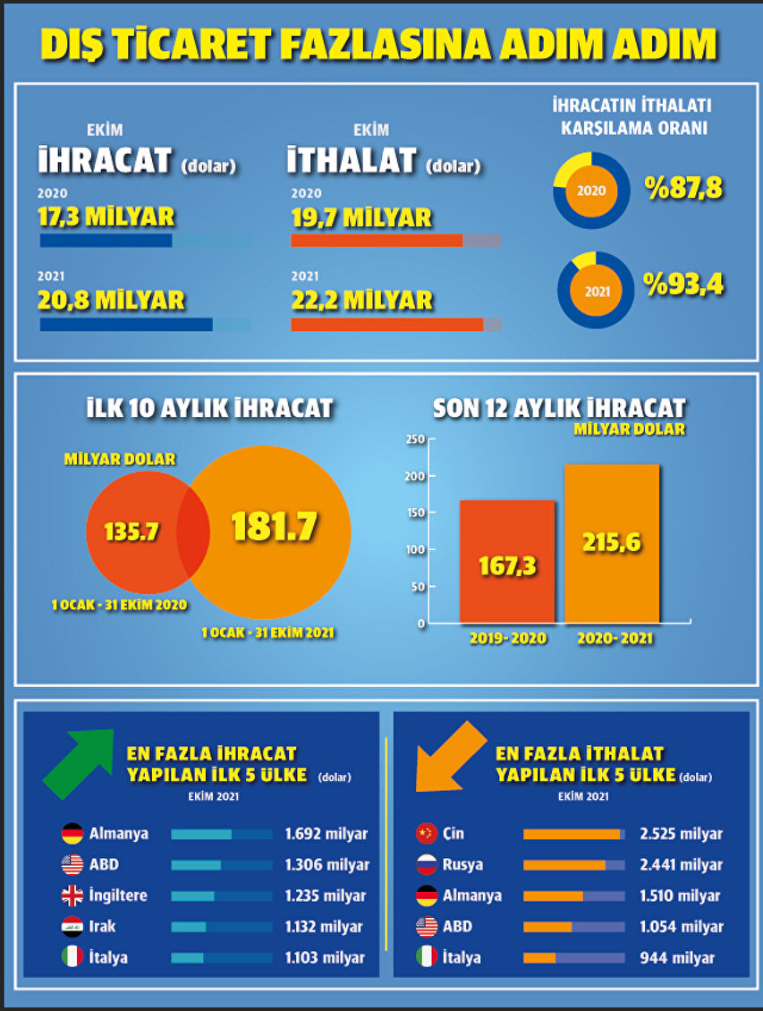Ekim’de 20,8 milyar dolarlık ihracatla tüm zamanların aylık rekoru tazelenirken, yılın ilk 10 ayında, geçtiğimiz yılın aynı dönemine göre yüzde 34’lük artışla 181,8 milyar dolarlık ihracat yapıldı. Son 12 aylık ihracat ise 215,7 milyar dolara ulaşarak, hedefin 4,7 milyar dolar üzerine çıktı.
