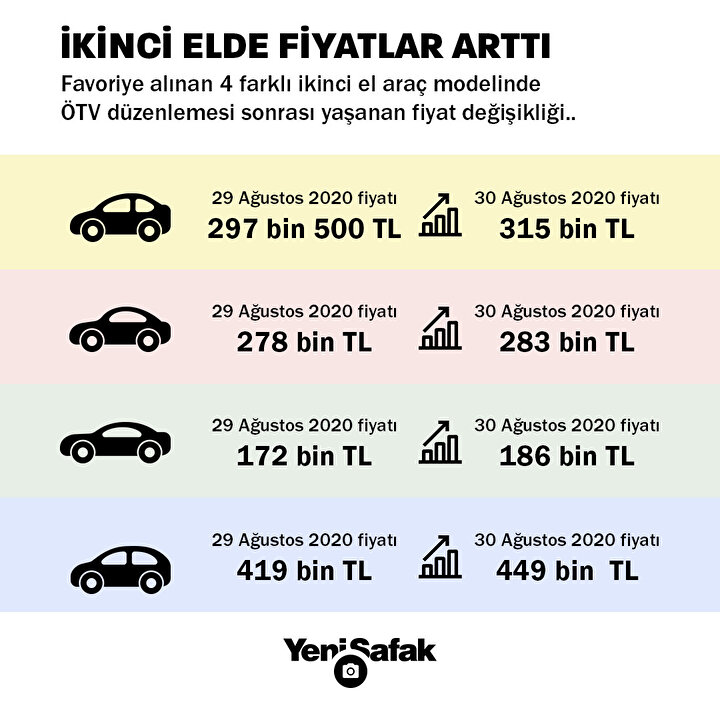 ÖTV düzenlemesi sonrası aracını satışa çıkaran çok sayıda kişi sıfır otomobil üreticileri gibi fiyat güncellemesi için kolları sıvadı. İkinci el araç satın almak için arayışta olan ve online kanallar üzerinden fiyatının düşmesi için favoriye alıp takipte kalan vatandaş ise 30 Ağustos itibariyle fiyatlardaki yukarı yönlü güncellemeyi görünce umudunu yitirmeye başladı.